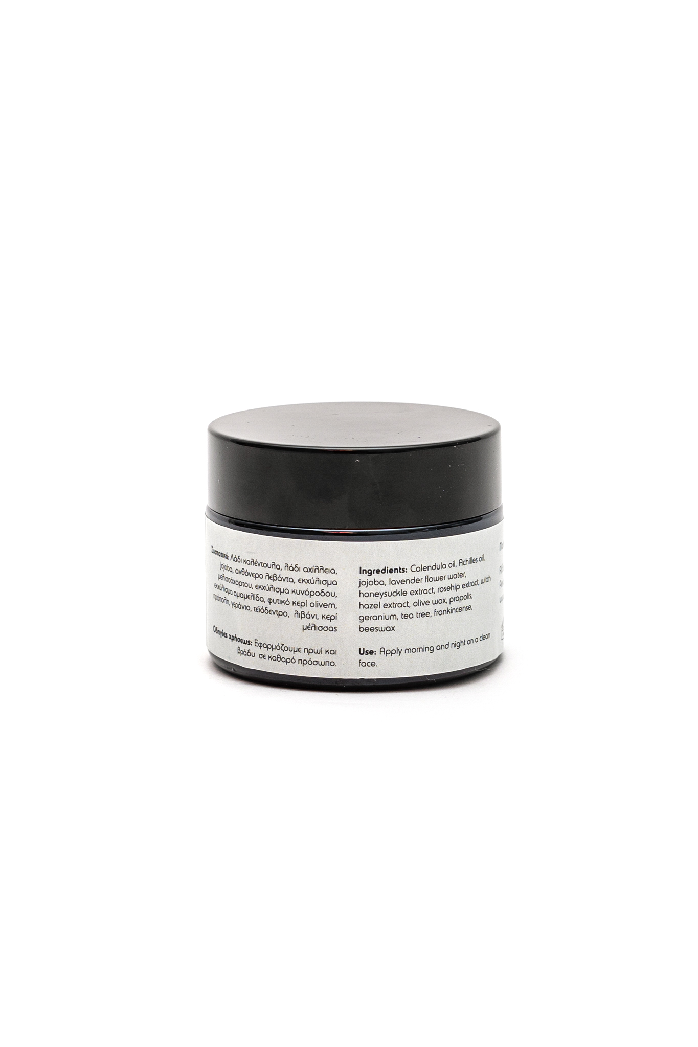 Συστατικά: Αχίλλεια, καλέντουλα, jojoba, λεβάντα, μελισσόχορτο, κυνόροδο, αμαμελίδα, πρόπολη, γεράνιο, τεϊόδεντρο, λιβάνι, κερί μέλισσας